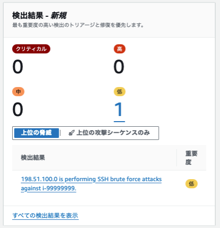 aws guardduty create-sample-findings --detector-id <あなたのDetector ID> --finding-types UnauthorizedAccess:EC2/SSHBruteForce